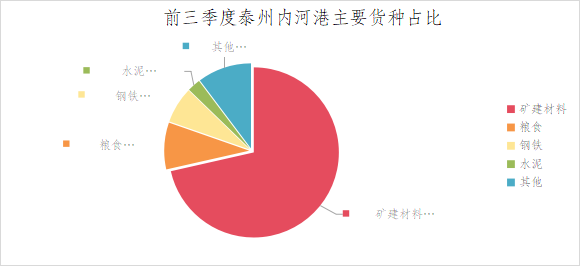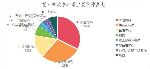 分货种来看,泰州港货种结构主要以矿建材料、煤炭及制品、金属矿石、粮食、化工原料及制品、非金属矿石、石油天然气及制品为主,分别占总吞吐量的32.3%、29.1%、16.2%、7.3%、3%、2.9%、2.8%,主要货种中吞吐量增速较快的为非金属矿石、粮食、矿建材料,分别增长32.4%、16.3%、12.5%。泰州内河港货种结构主要以矿建材料、粮食、钢铁、水泥为主,分别占总吞吐量的71.5%、8.9%、6.9%、2.5%,主要货种中吞吐量增速较快的为矿建材料、粮食,分别增长38%、19.1%。