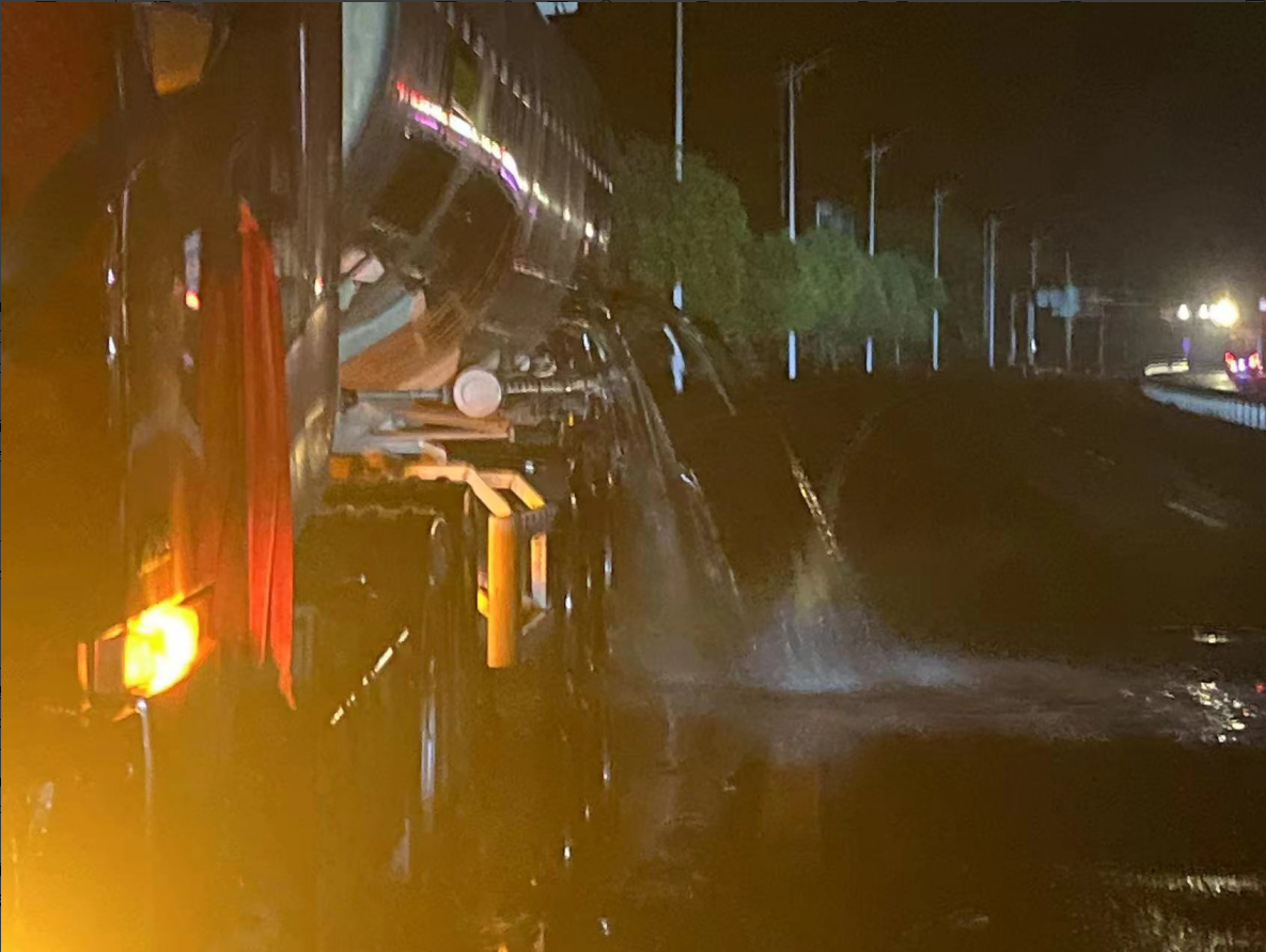 2024年9月12日凌晨2点40分,356省道靖江段突发交通事故:一辆重型半挂牵引车因驾驶员操作失误,与停靠在路侧的重型罐式半挂牵引车发生碰撞,导致罐内转基因大豆油大面积泄漏,路面、护栏、河道及绿化带均遭受严重污染。事故发生后,泰州公路部门第一时间启动应急响应预案,组织人员、调配机械和材料赶赴现场清理油污。但车辆碾压导致沿线道路标线污染严重、模糊难辨,必须通过重新施划来进行恢复。经交警部门认定,重型半挂牵引车驾驶员负事故主要责任,罐车驾驶员负次要责任。