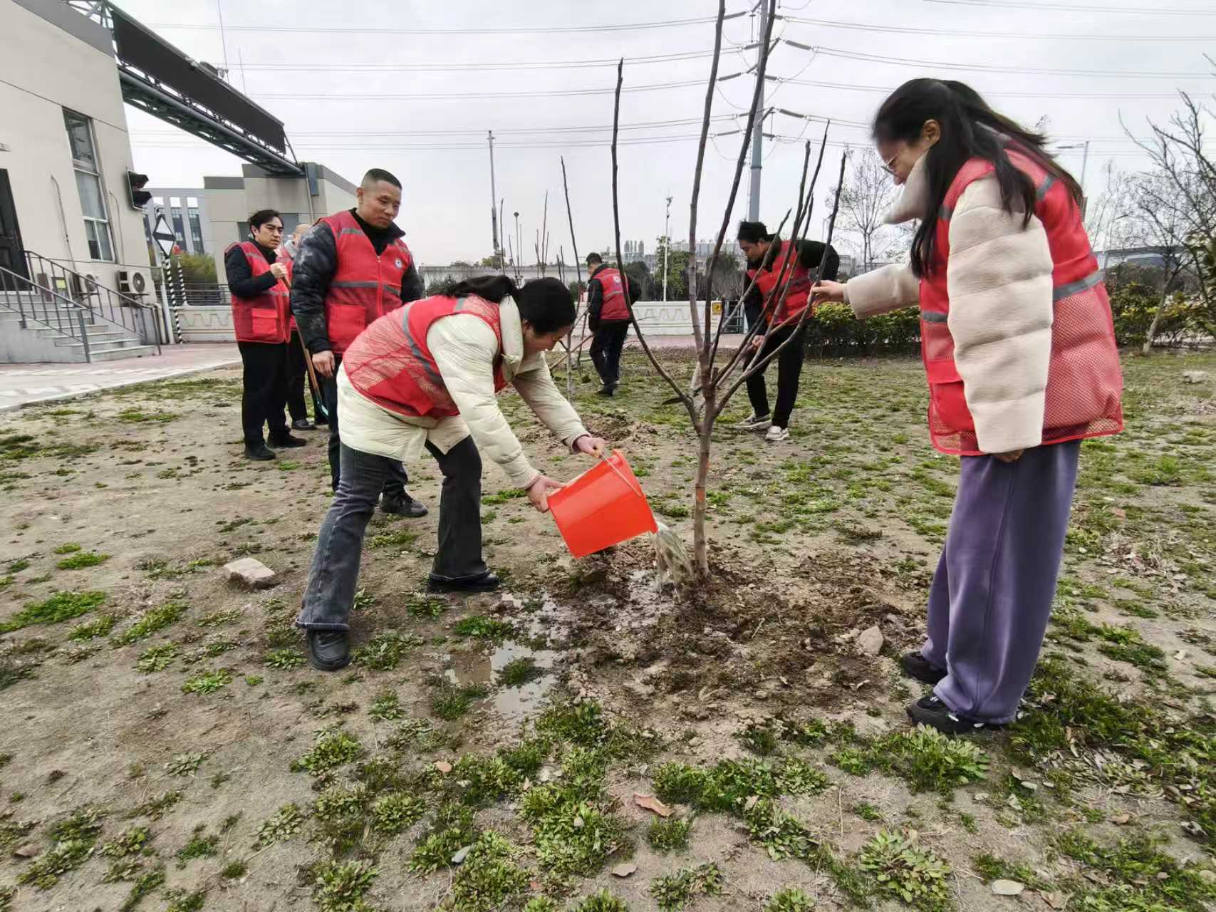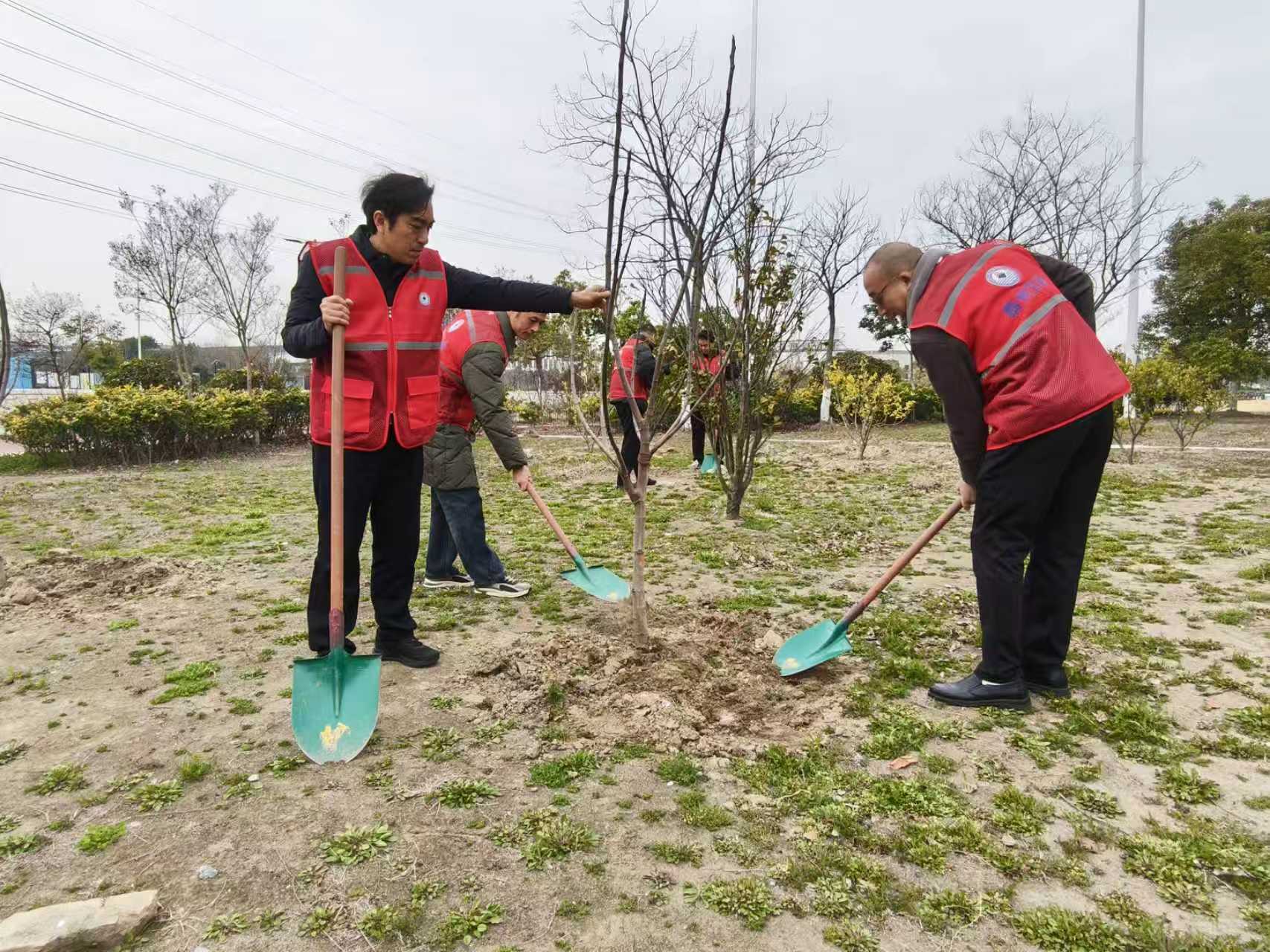 上午10时许,干部职工们身着志愿者服装,热情高涨地聚集在提前规划好的植树点位。现场树苗、铁锹、水桶等物资一应俱全。大家三五人一组,分工协作,配合默契。有人挥锹铲土,有人扶苗填坑,有人提水浇灌,每一道工序都做得一丝不苟。“坑再挖深一点,树苗要扶正,土要踩实……”经验丰富的老职工边干边指导,现场欢声笑语交织成一派热火朝天的劳动景象。在大家的共同努力下,一株株新栽的树苗迎风挺立,原本空旷的土地上瞬间焕发出勃勃生机。