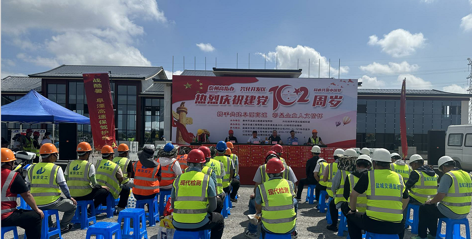 8月4日上午,泰州市高速公路建设指挥部联合建兴高速JHX-22标、总监办、质安中心,在建兴高速千垛服务区东广场开展了以“学精神 送清凉 保安全 促生产”为主题的路地共建党建活动。泰州市高速公路建设指挥部办公室现场副指挥长卢宁、建兴项目办主任黄钢、兴化开发区临城街道、开发区交警中队的相关领导以及建兴高速泰州段参建单位70余名党员、群众代表参加。