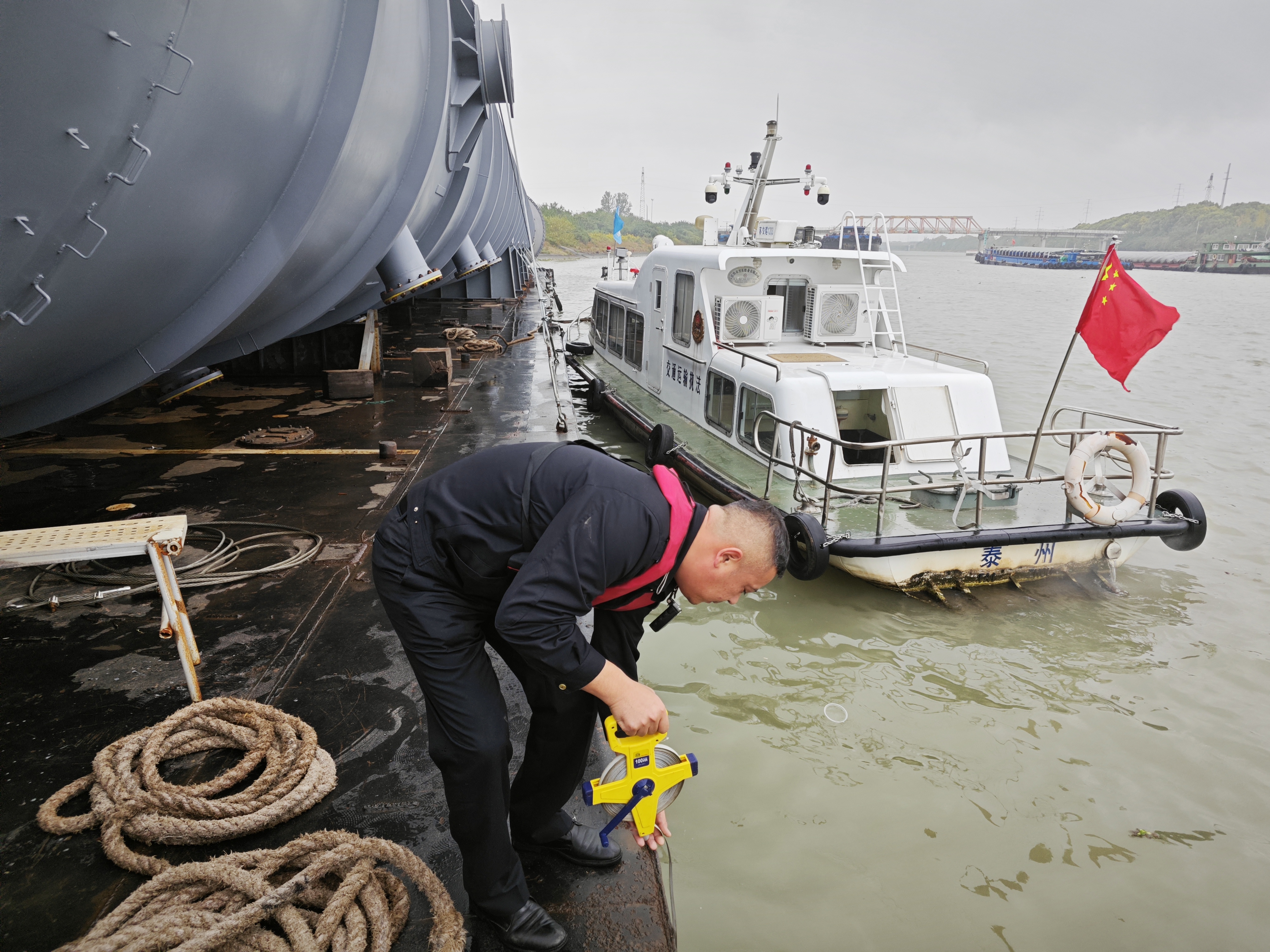 (执法人员对大件运输船舶进行现场核验)