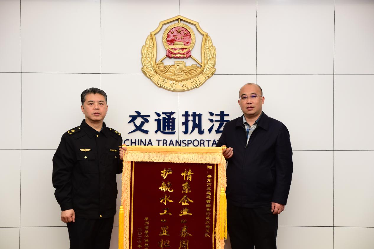 3月30日,泰州金泰环保热电有限公司专程将一面绣有——情系企业“泰周到”、护航水工“显担当”的锦旗送至市交通执法支队,以表达对支队高效审批、精准护航,保障其供热管网工程跨越南官河航道施工顺利完成的诚挚谢意。